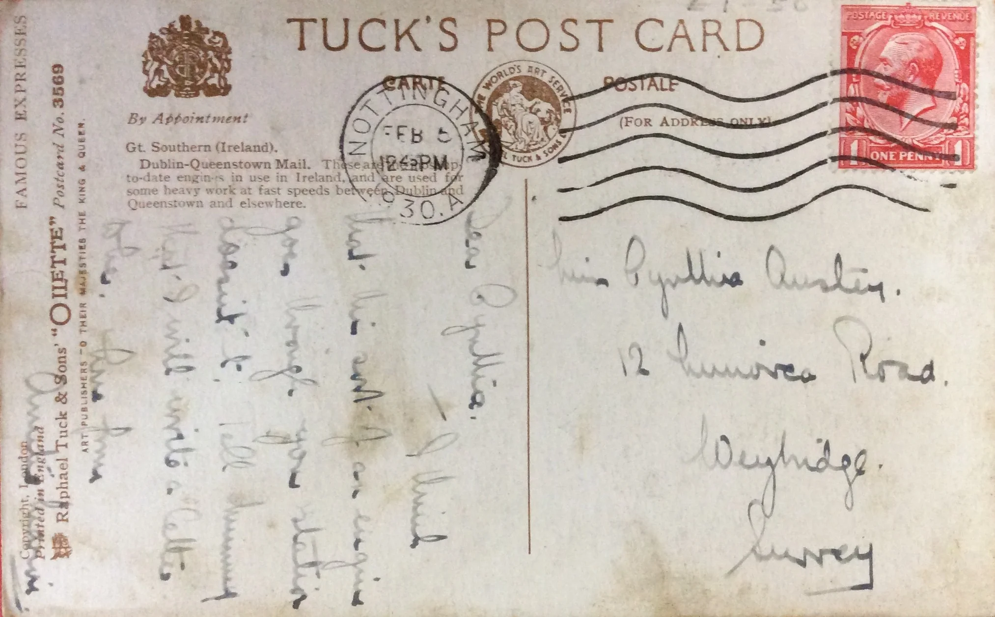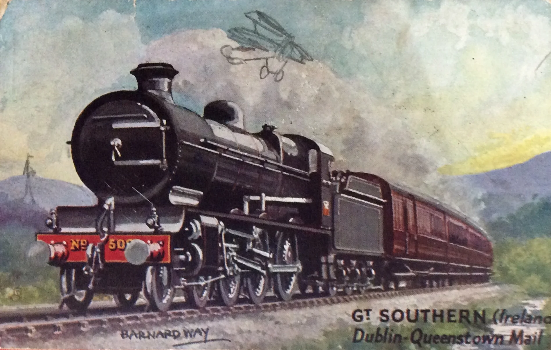 The picture on the card is from a series called Famous Expresses. The engine is not named as many are. It represents the Great Southern Dublin to Queenstown (now Cobh) mail train. The painting is signed Barnard Way. Robert Barnard Way was a noted painter of railway subjects as this blog post reveals. https://bearalley.blogspot.co.uk/2008/10/r-barnard-way.html