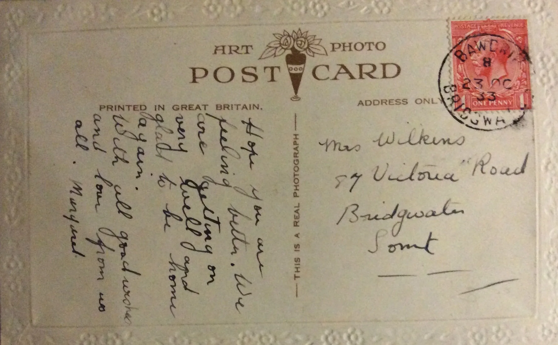 Marion Ada Wilkins nee Croker (1903-1987) was the daughter of William Thomas Frederick Charles Croker (1873-1955) and Ada Harvey (1871-1965). William was a master baker in Bridgewater. Marion was one of three children. In 1929, Marion married Albert Edwin Wilkins who was a master butcher from Leeds, Yorkshire. They had one child and both died in Somerset.
