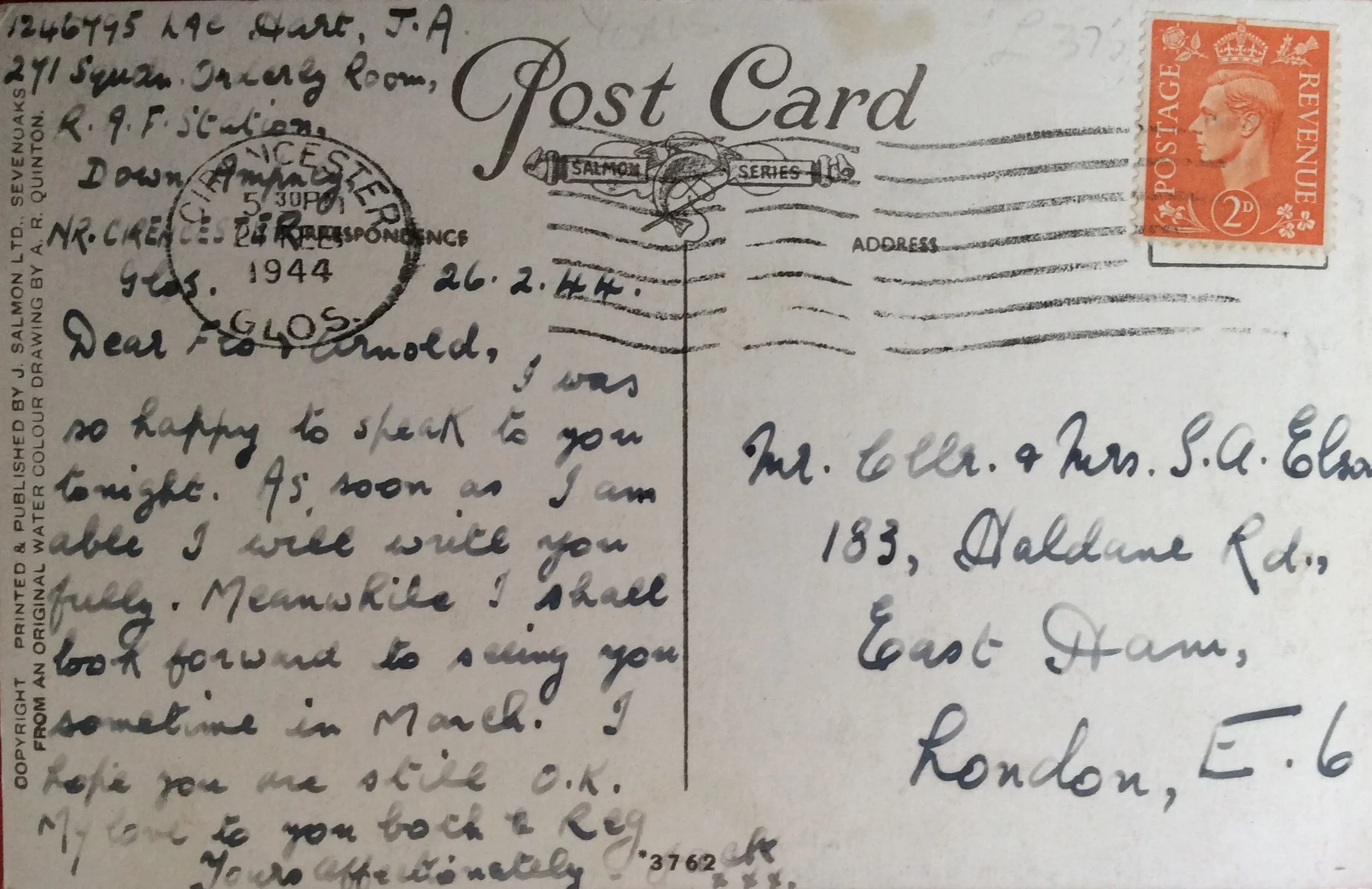 John (Jack) Albert Hart was born in West Ham. I 1939, at the outbreak of WWII he was working as a Civil Servant aged 26 and living with his widowed mother Louisa. At the time that the card was sent, Jack was on active service with the RAF at Down Ampney. This was February 1944, four months before D-Day and Down Ampney played a big part in the air support provided for the landings. Jack was not air crew. At the time of sending the card, Jack was 31 years old. From 1935 to 1985 he served as a Labour Councillor in Newham in London. He seems to have been well respected and well liked. In 1985 he was given the freedom of Newham having previously been awarded the MBE.