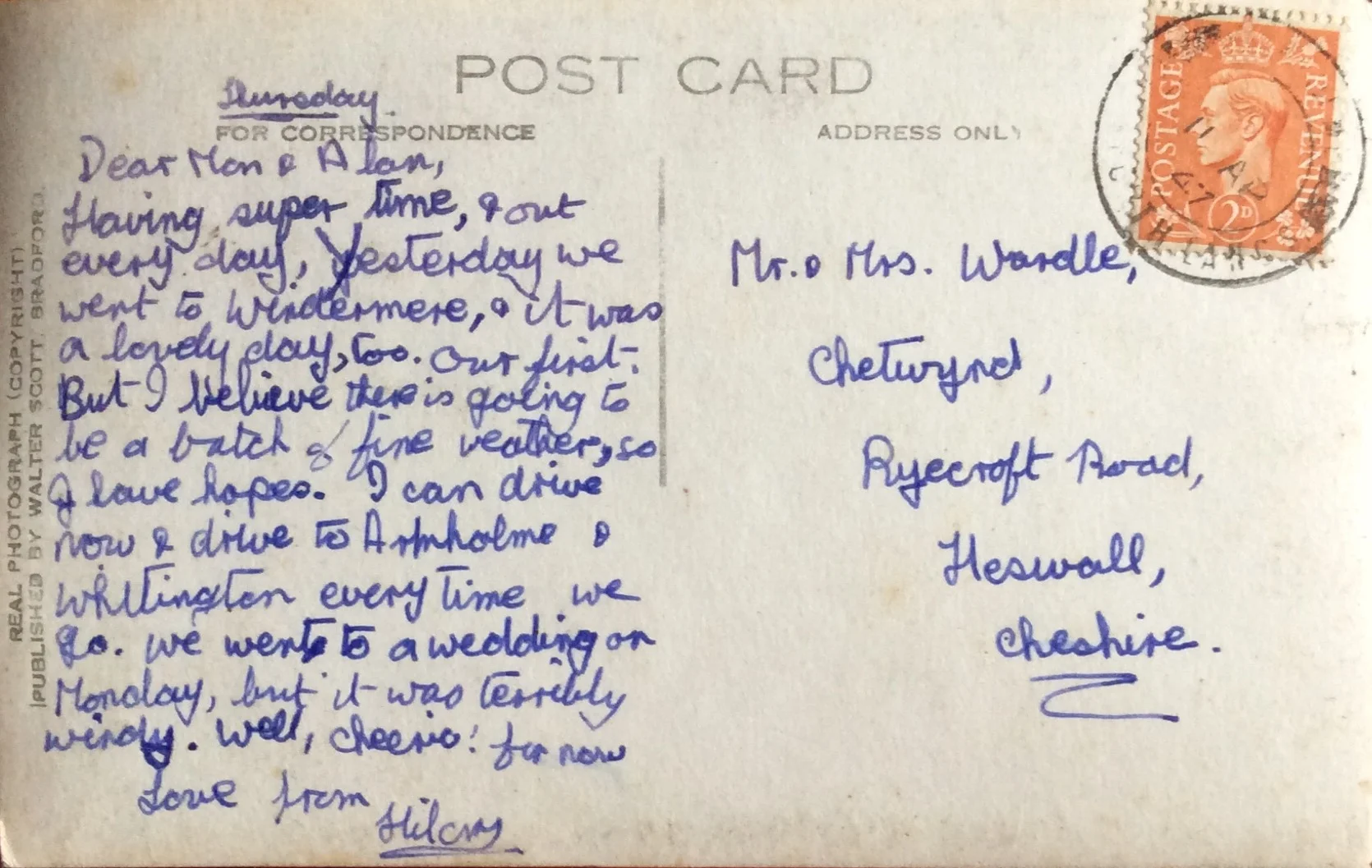 Having super time, & out every day. Yesterday we went to Windermere, & it was a lovely day, too. Our first. But I believe there is going to be a batch of fine weather, so I have hopes. I can drive now & drive to Armholme & Whitington every time we go. We went to a wedding on Monday, but it was terribly windy. Well, cheerio! for now