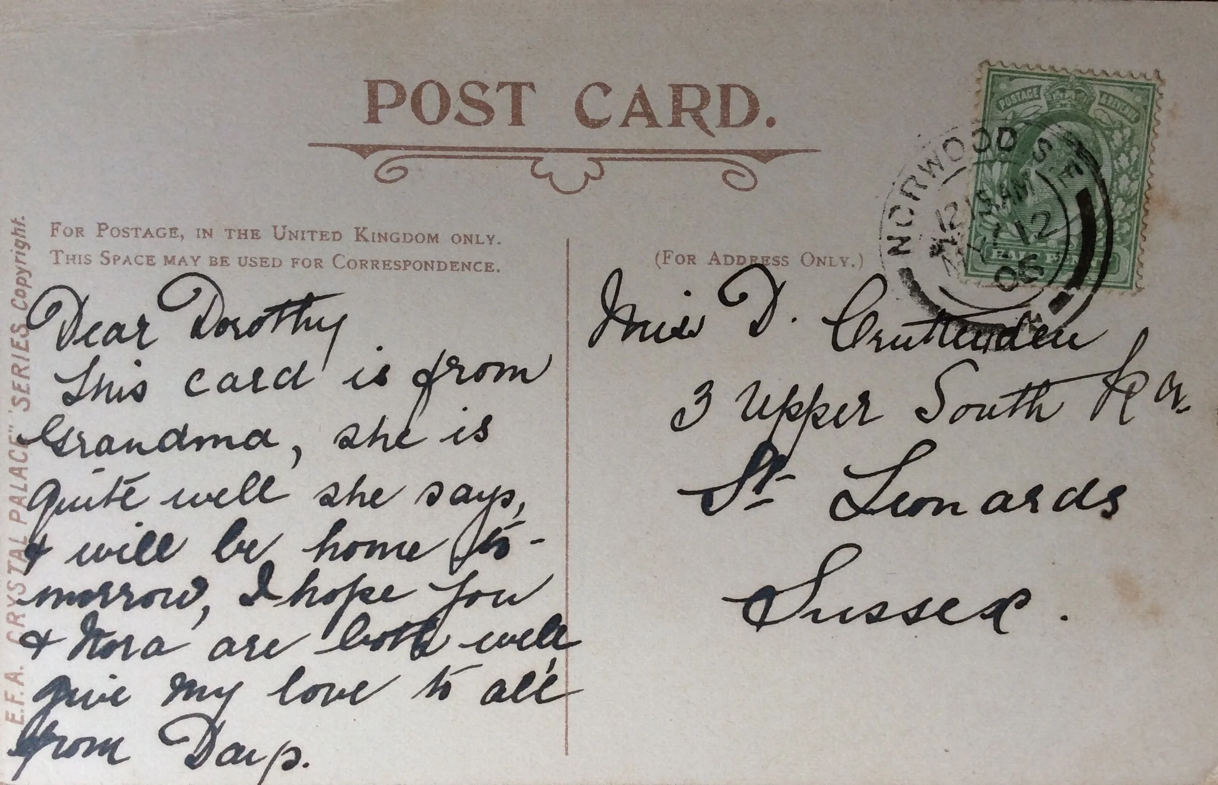 The message mentions Grandma. Grandma is Lydia Cruttenden nee Parsons (1846-1915). Lydia had an interesting childhood. Her mother was Charlotte Parsons (1815-). Lydia was born in 1846 and in 1852 Charlotte married George Swadling (1809-1893). Charlotte was therefore a single mother until for about 6 years and in some of the census records, Lydia is entered as Lydia Swadling. This probably changed when she came to get married to Samuel Cruttenden (1838-1904), Alfred's father in 1868. Samuel and Lydia had 10 children. In 1905, when this card was sent, Lydia was 59 years old and a widow. Where she had been, presumably somewhere in Norwood, is not known but she is well and planning to return home, wherever that is. The card is sent to Dorothy who was only 8 years old. It is an open question as to whether Lydia could write and whether at that age, Dorothy could read joined up writing.
