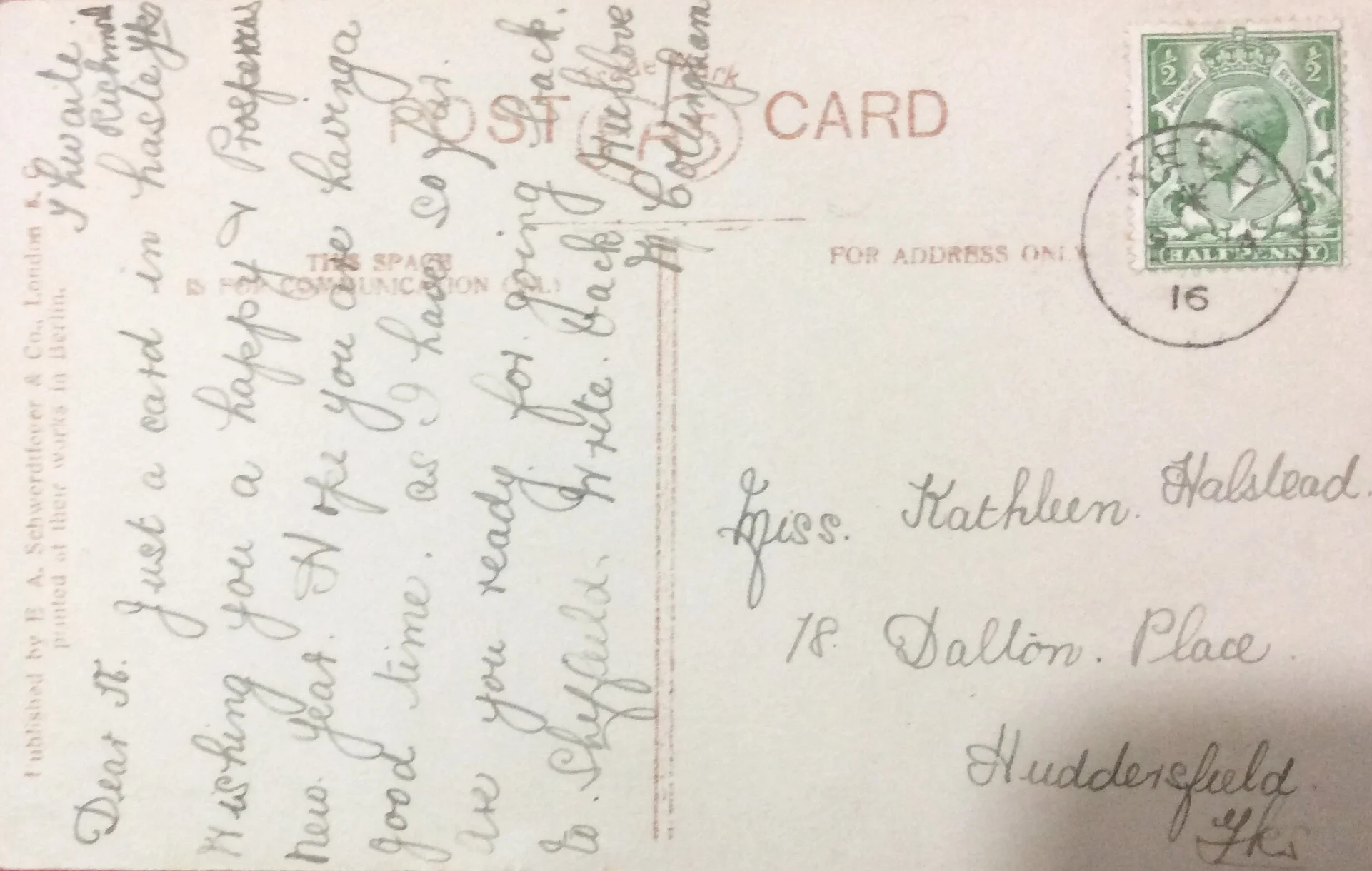 Kathleen Mary Hannah Halstead (1896-1972) was the daughter of George Randal Halstead (1859-1935) and Mary Elizabeth Smith (1859-1919). George was a warehouseman working for a tea blender in Huddersfield. In January 1916 when the card was sent, Kathleen would have been 19 years old.